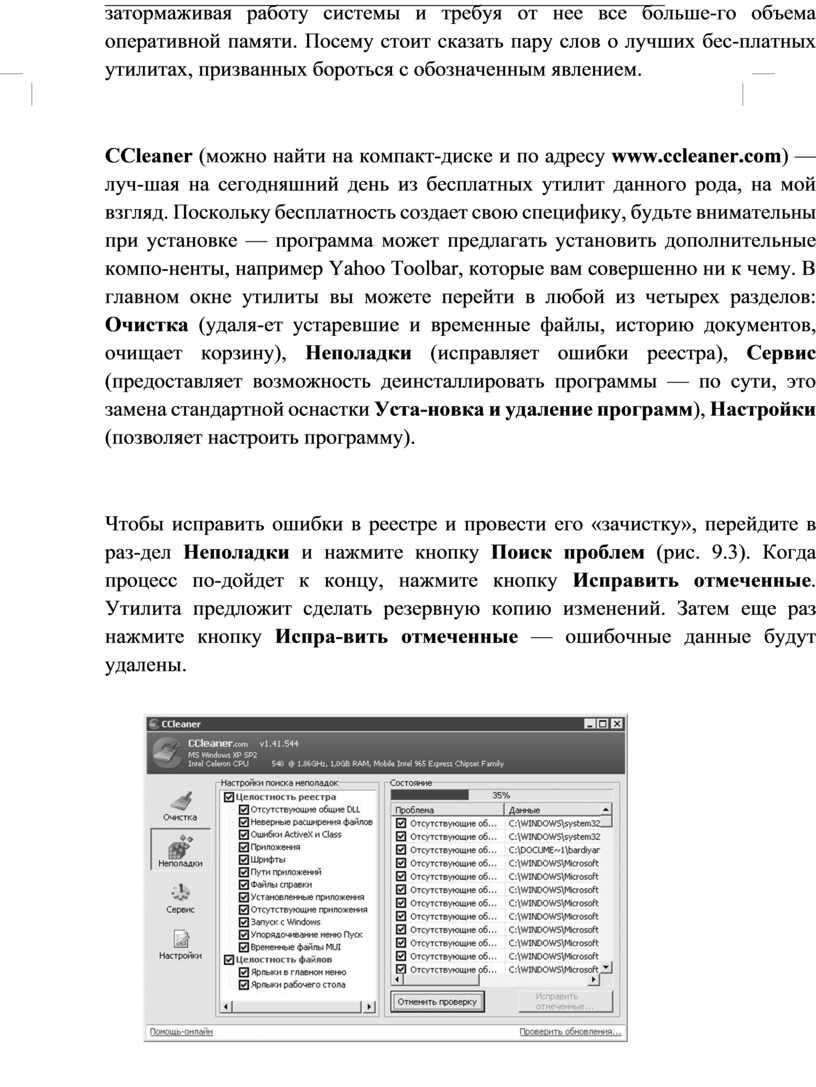 Чтобы исправить ошибки в реестре и провести его «зачистку», перейдите в раз-дел Неполадки и нажмите кнопку Поиск проблем (рис. 9.3). Когда процесс по-дойдет к концу, нажмите кнопку Исправить отмеченные. Утилита предложит сделать резервную копию изменений. Затем еще раз нажмите кнопку Испра-вить отмеченные — ошибочные данные будут удалены.