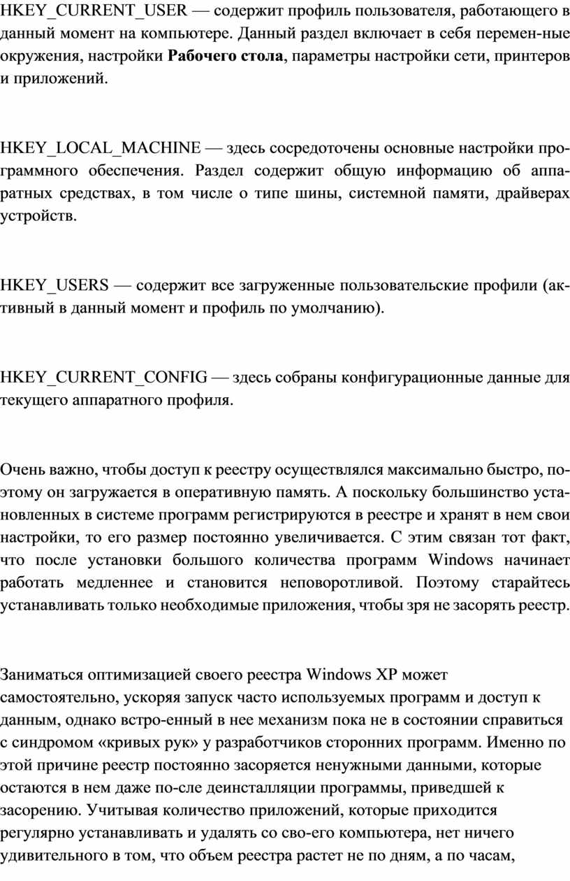 HKEY_CURRENT_USER — содержит профиль пользователя, работающего в данный момент на компьютере. Данный раздел включает в себя перемен-ные окружения, настройки Рабочего стола, параметры настройки сети, принтеров и приложений.
