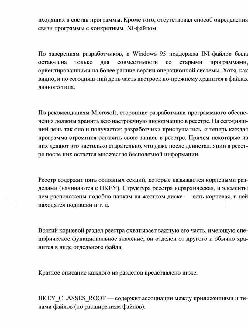 своем современном виде реестр впервые появился в Windows 95. Планирова-лось, что он полностью заменит INI-файлы, в которых ранее хранилась вся на-строечная информация. Произвести замену потребовалось из-за того, что поль-зователям было сложно разобраться во множестве INI-файлов, входящих в состав программы. Кроме того, отсутствовал способ определения связи программы с конкретным INI-файлом.