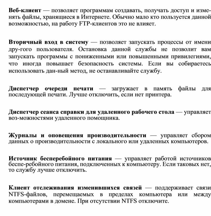 Источник бесперебойного питания — управляет работой источников беспе-ребойного питания, подключенных к компьютеру. Если таковых нет, то службу лучше отключить.