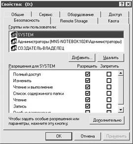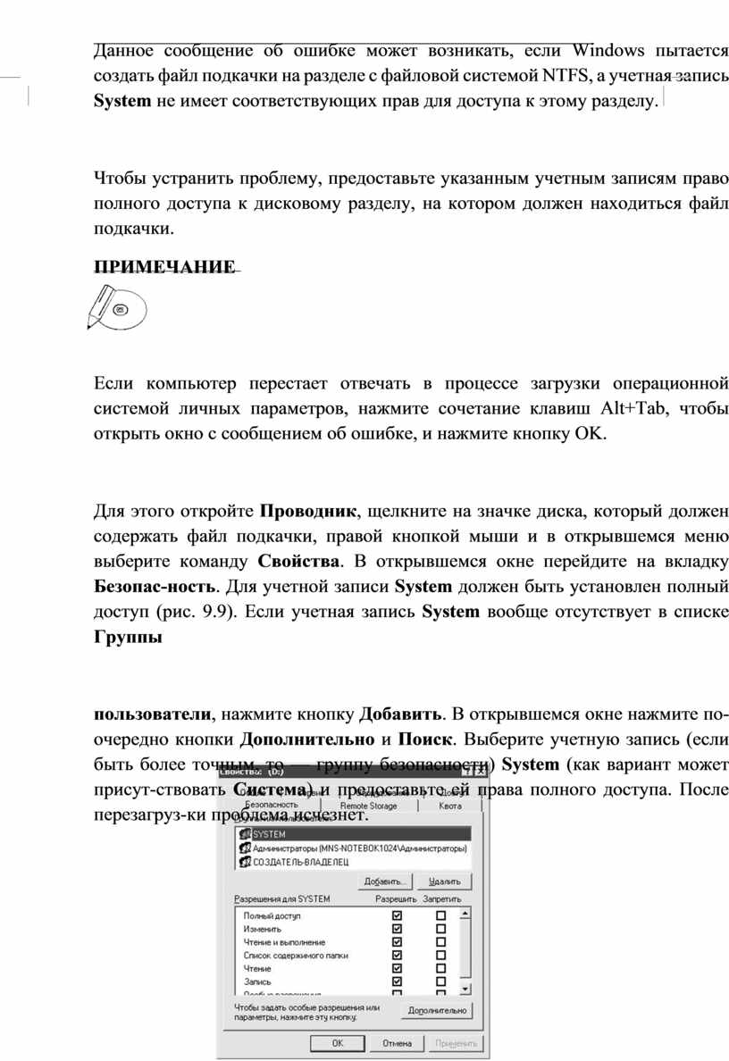 Для этого откройте Проводник, щелкните на значке диска, который должен содержать файл подкачки, правой кнопкой мыши и в открывшемся меню выберите команду Свойства. В открывшемся окне перейдите на вкладку Безопас-ность. Для учетной записи System должен быть установлен полный доступ (рис. 9.9). Если учетная запись System вообще отсутствует в списке Группы
