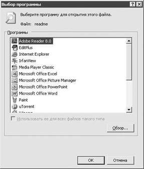 Мы даже и не замечаем, насколько привыкли к тому, что все подчиняется стан-дартам. Щелкая кнопкой мыши на текстовом файле, мы ожидаем, что он откро-ется в удобном для прочтения виде. Чаще всего так и происходит, но порой случаются исключения, когда производится попытка открыть файл с нестан-дартным расширением (например, NFO, RUS, LNG) или вообще без него. При-веденная в смятенье Windows тут же открывает окно Выбор программы (рис. 9.12),