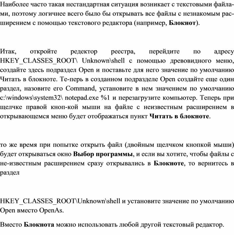 Наиболее часто такая нестандартная ситуация возникает с текстовыми файла-ми, поэтому логичнее всего было бы открывать все файлы с незнакомым рас-ширением с помощью текстового редактора (например, Блокнот).