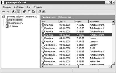 Если система работает нестабильно, для первичной диагностики обычно исполь-зуют оснастку Event Viewer (откройте меню Пуск Выполнить и в открывшемся окне наберите команду eventvwr.msc). С помощью данной оснастки можно просмотреть, какие приложения и службы вызывали ошибки (рис. 9.16).