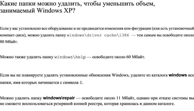 Какие папки можно удалить, чтобы уменьшить объем, занимаемый Windows XP?