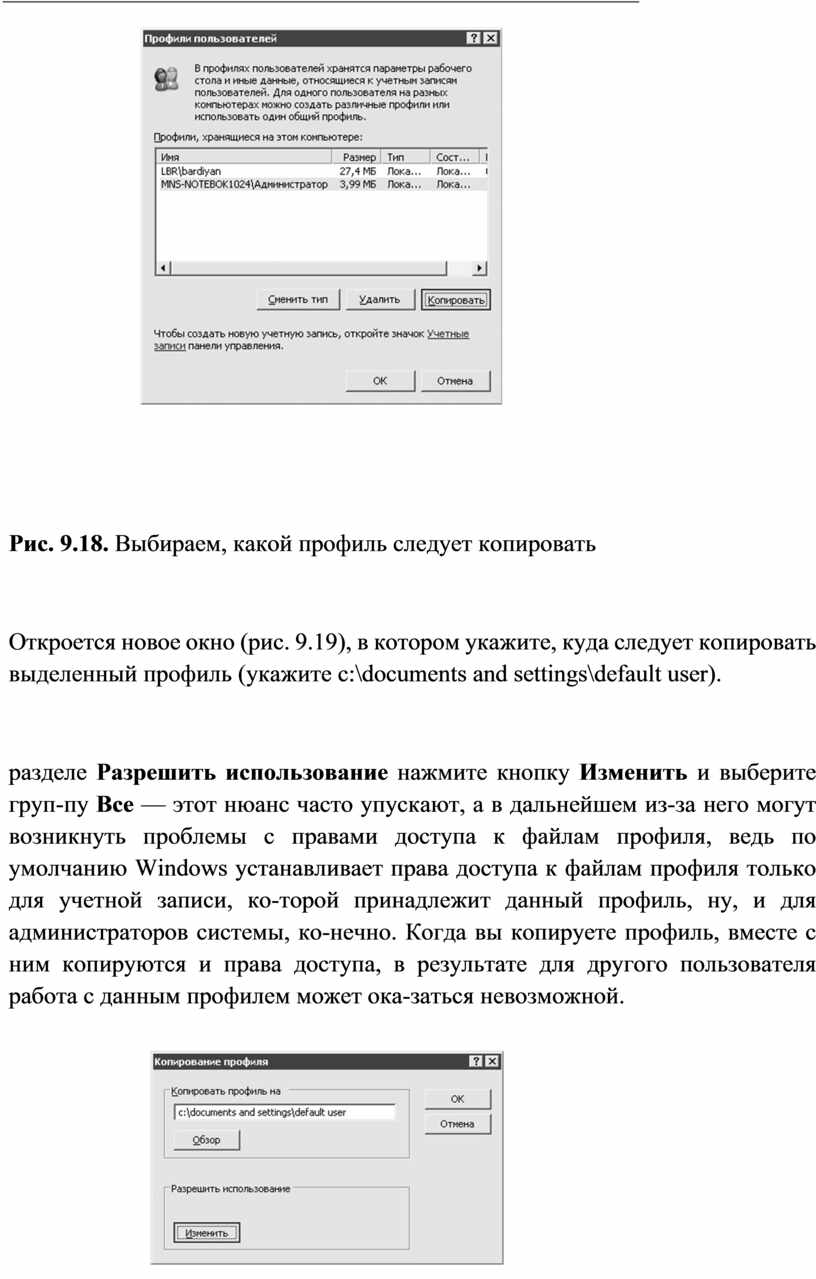 разделе Разрешить использование нажмите кнопку Изменить и выберите груп-пу Все — этот нюанс часто упускают, а в дальнейшем из-за него могут возникнуть проблемы с правами доступа к файлам профиля, ведь по умолчанию Windows устанавливает права доступа к файлам профиля только для учетной записи, ко-торой принадлежит данный профиль, ну, и для администраторов системы, ко-нечно. Когда вы копируете профиль, вместе с ним копируются и права доступа, в результате для другого пользователя работа с данным профилем может ока-заться невозможной.