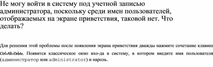 Не могу войти в систему под учетной записью администратора, поскольку среди имен пользователей, отображаемых на экране приветствия, таковой нет. Что делать?
