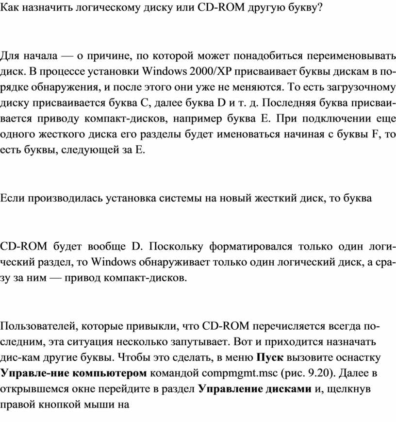 Для начала — о причине, по которой может понадобиться переименовывать диск. В процессе установки Windows 2000/XP присваивает буквы дискам в по-рядке обнаружения, и после этого они уже не меняются. То есть загрузочному диску присваивается буква C, далее буква D и т. д. Последняя буква присваи-вается приводу компакт-дисков, например буква Е. При подключении еще одного жесткого диска его разделы будет именоваться начиная с буквы F, то есть буквы, следующей за Е.