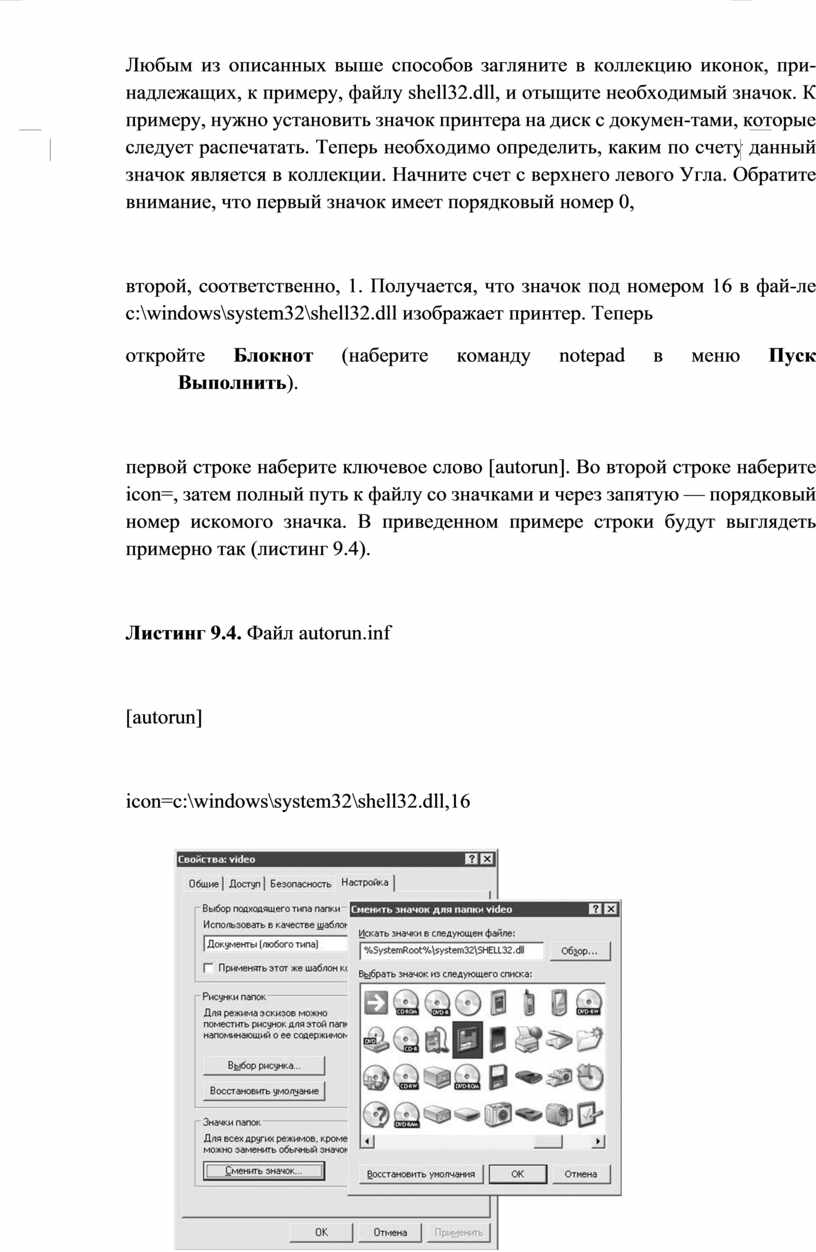 первой строке наберите ключевое слово [autorun]. Во второй строке наберите icon=, затем полный путь к файлу со значками и через запятую — порядковый номер искомого значка. В приведенном примере строки будут выглядеть примерно так (листинг 9.4).