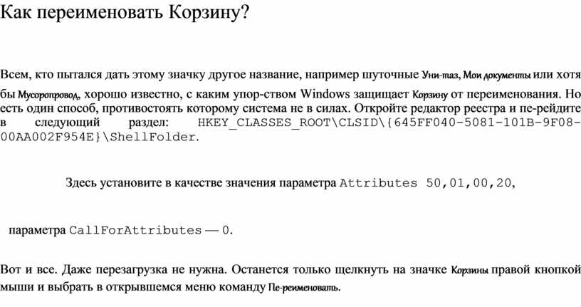 Всем, кто пытался дать этому значку другое название, например шуточные Уни-таз, Мои документы или хотя бы Мусоропровод, хорошо известно, с каким упор-ством Windows защищает Корзину от переименования. Но есть один способ, противостоять которому система не в силах. Откройте редактор реестра и пе-рейдите в следующий раздел: HKEY_CLASSES_ROOT\CLSID\{645FF040-5081-101B-9F08-00AA002F954E}\ShellFolder.