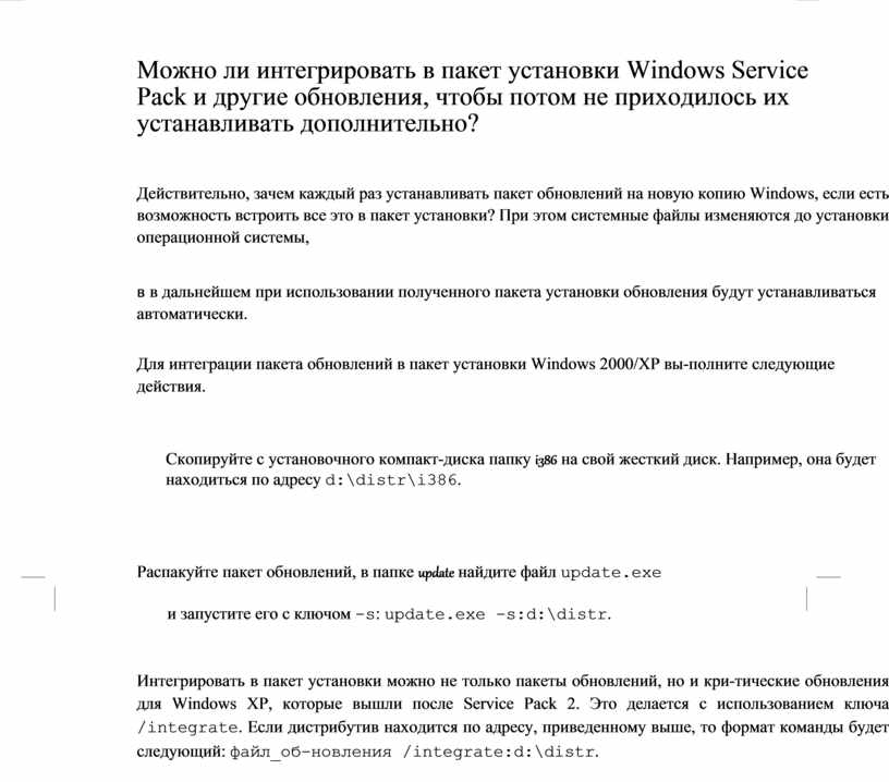 Для интеграции пакета обновлений в пакет установки Windows 2000/XP вы-полните следующие действия.