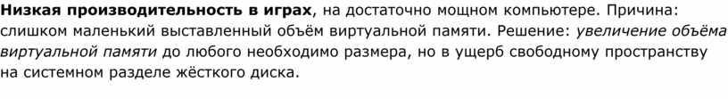 Низкая производительность в играх, на достаточно мощном компьютере. Причина: слишком маленький выставленный объём виртуальной памяти. Решение: увеличение объёма виртуальной памяти до любого необходимо размера, но в ущерб свободному пространству на системном разделе жёсткого диска.