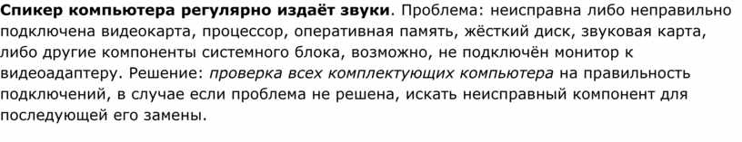 Спикер компьютера регулярно издаёт звуки. Проблема: неисправна либо неправильно подключена видеокарта, процессор, оперативная память, жёсткий диск, звуковая карта, либо другие компоненты системного блока, возможно, не подключён монитор к видеоадаптеру. Решение: проверка всех комплектующих компьютера на правильность подключений, в случае если проблема не решена, искать неисправный компонент для последующей его замены.