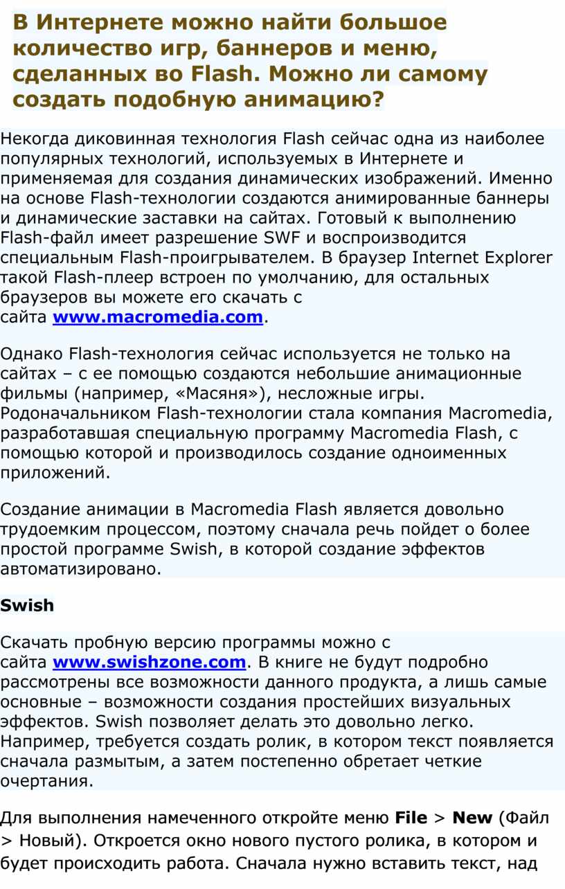 Создание анимации в Macromedia Flash является довольно трудоемким процессом, поэтому сначала речь пойдет о более простой программе Swish, в которой создание эффектов автоматизировано.