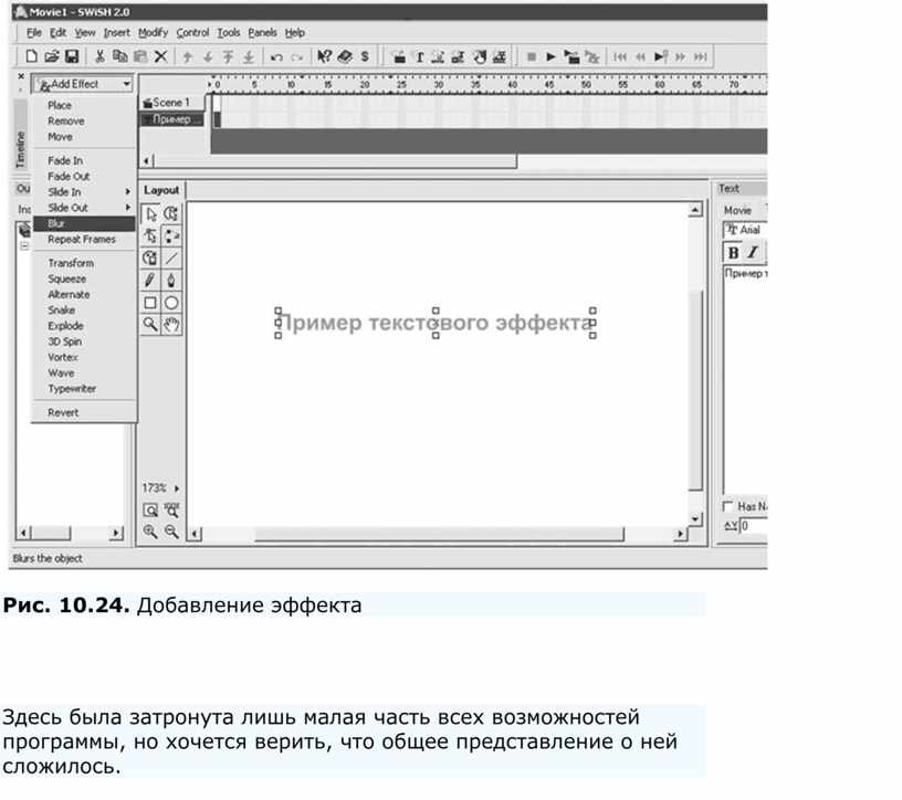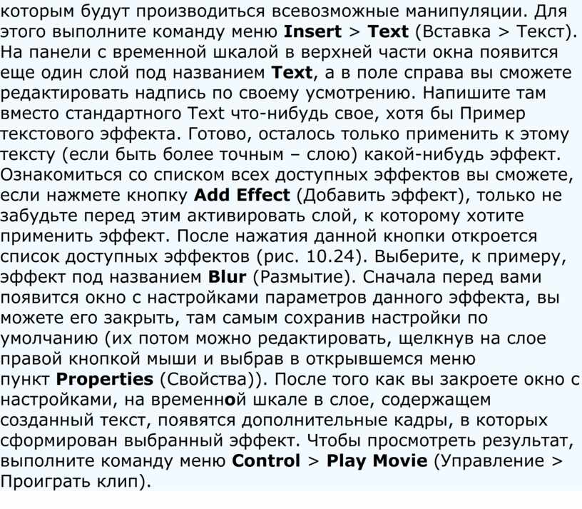 Для выполнения намеченного откройте меню File > New (Файл > Новый). Откроется окно нового пустого ролика, в котором и будет происходить работа. Сначала нужно вставить текст, над которым будут производиться всевозможные манипуляции. Для этого выполните команду меню Insert > Text (Вставка > Текст). На панели с временной шкалой в верхней части окна появится еще один слой под названием Text, а в поле справа вы сможете редактировать надпись по своему усмотрению. Напишите там вместо стандартного Text что-нибудь свое, хотя бы Пример текстового эффекта. Готово, осталось только применить к этому тексту (если быть более точным – слою) какой-нибудь эффект. Ознакомиться со списком всех доступных эффектов вы сможете, если нажмете кнопку Add Effect (Добавить эффект), только не забудьте перед этим активировать слой, к которому хотите применить эффект. После нажатия данной кнопки откроется список доступных эффектов (рис. 10.24). Выберите, к примеру, эффект под названием Blur (Размытие). Сначала перед вами появится окно с настройками параметров данного эффекта, вы можете его закрыть, там самым сохранив настройки по умолчанию (их потом можно редактировать, щелкнув на слое правой кнопкой мыши и выбрав в открывшемся меню пункт Properties (Свойства)). После того как вы закроете окно с настройками, на временной шкале в слое, содержащем созданный текст, появятся дополнительные кадры, в которых сформирован выбранный эффект. Чтобы просмотреть результат, выполните команду меню Control > Play Movie (Управление > Проиграть клип).