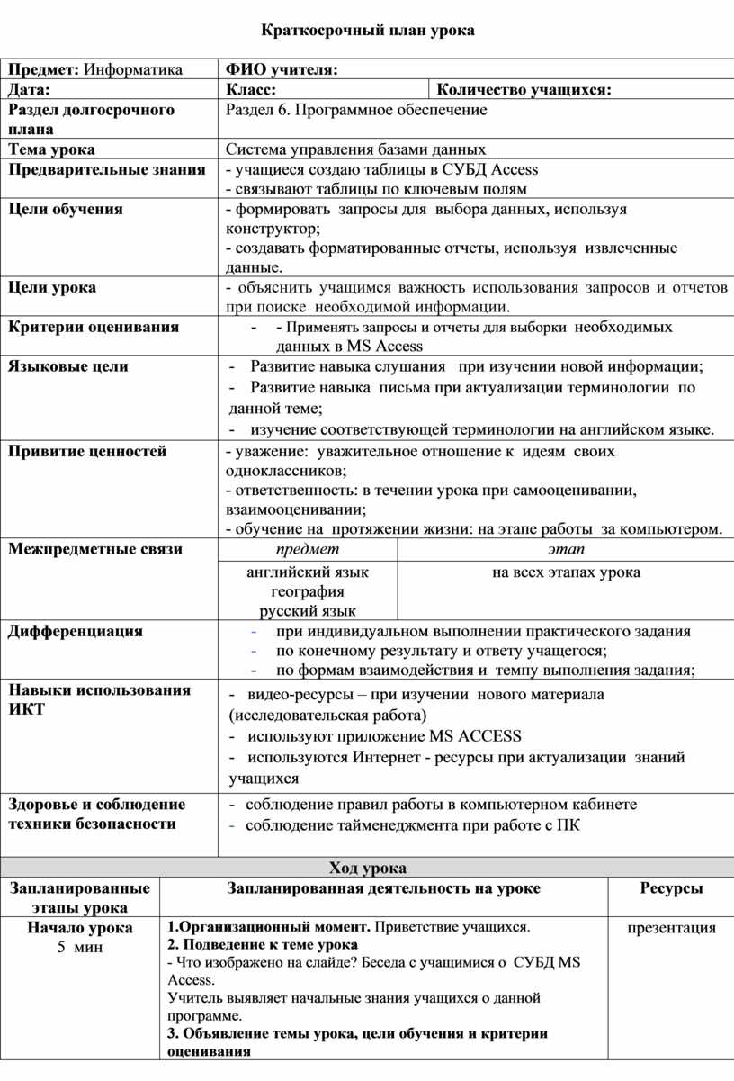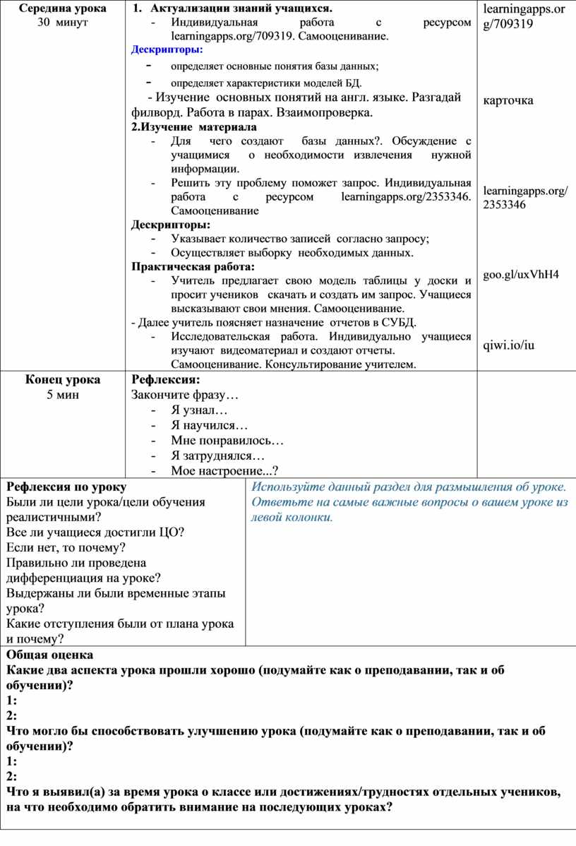1. Актуализации знаний учащихся. - Индивидуальная работа с ресурсом learningapps.org/709319. Самооценивание. Дескрипторы: - определяет основные понятия базы данных; - определяет характеристики моделей БД. - Изучение основных понятий на англ. языке. Разгадай филворд. Работа в парах. Взаимопроверка. 2.Изучение материала - Для чего создают базы данных?. Обсуждение с учащимися о необходимости извлечения нужной информации. - Решить эту проблему поможет запрос. Индивидуальная работа с ресурсом learningapps.org/2353346. Самооценивание Дескрипторы: - Указывает количество записей согласно запросу; - Осуществляет выборку необходимых данных. Практическая работа: - Учитель предлагает свою модель таблицы у доски и просит учеников скачать и создать им запрос. Учащиеся высказывают свои мнения. Самооценивание. - Далее учитель поясняет назначение отчетов в СУБД. - Исследовательская работа. Индивидуально учащиеся изучают видеоматериал и создают отчеты. Самооценивание. Консультирование учителем. |
