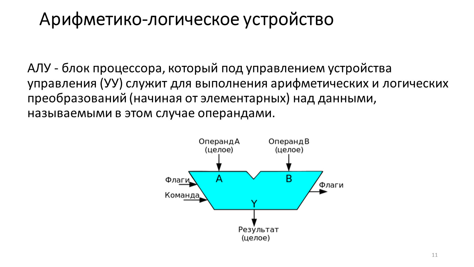 АЛУ - блок процессора, который под управлением устройства управления (УУ) служит для выполнения арифметических и логических преобразований (начиная от элементарных) над данными, называемыми в этом случае операндами.
