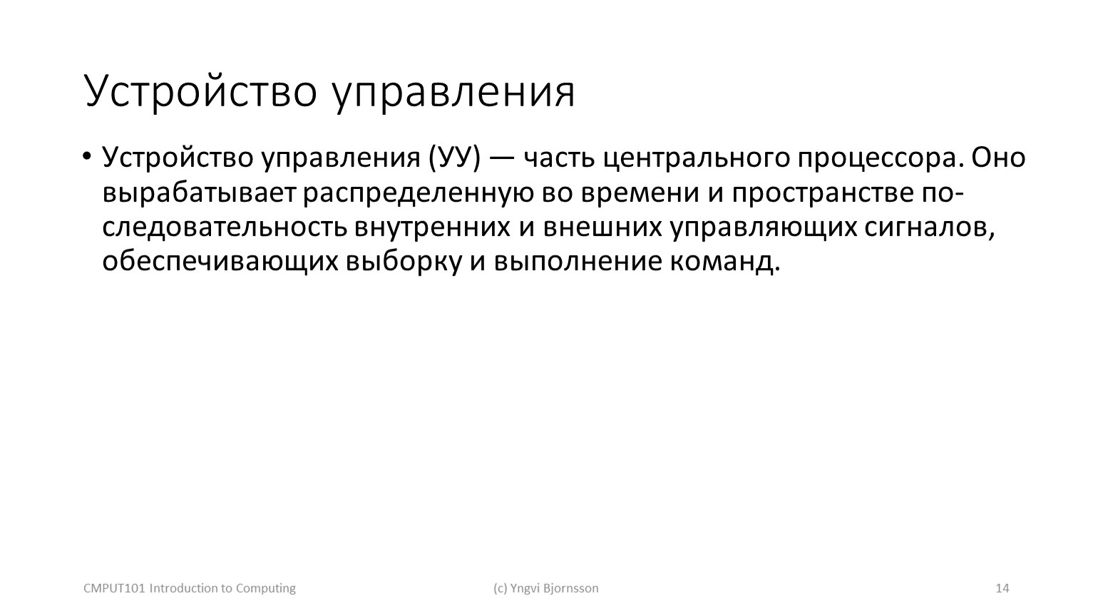 Устройство управления (УУ) — часть центрального процессора. Оно вырабатывает распределенную во времени и пространстве последовательность внутренних и внешних управляющих сигналов, обеспечивающих выборку и выполнение команд.
