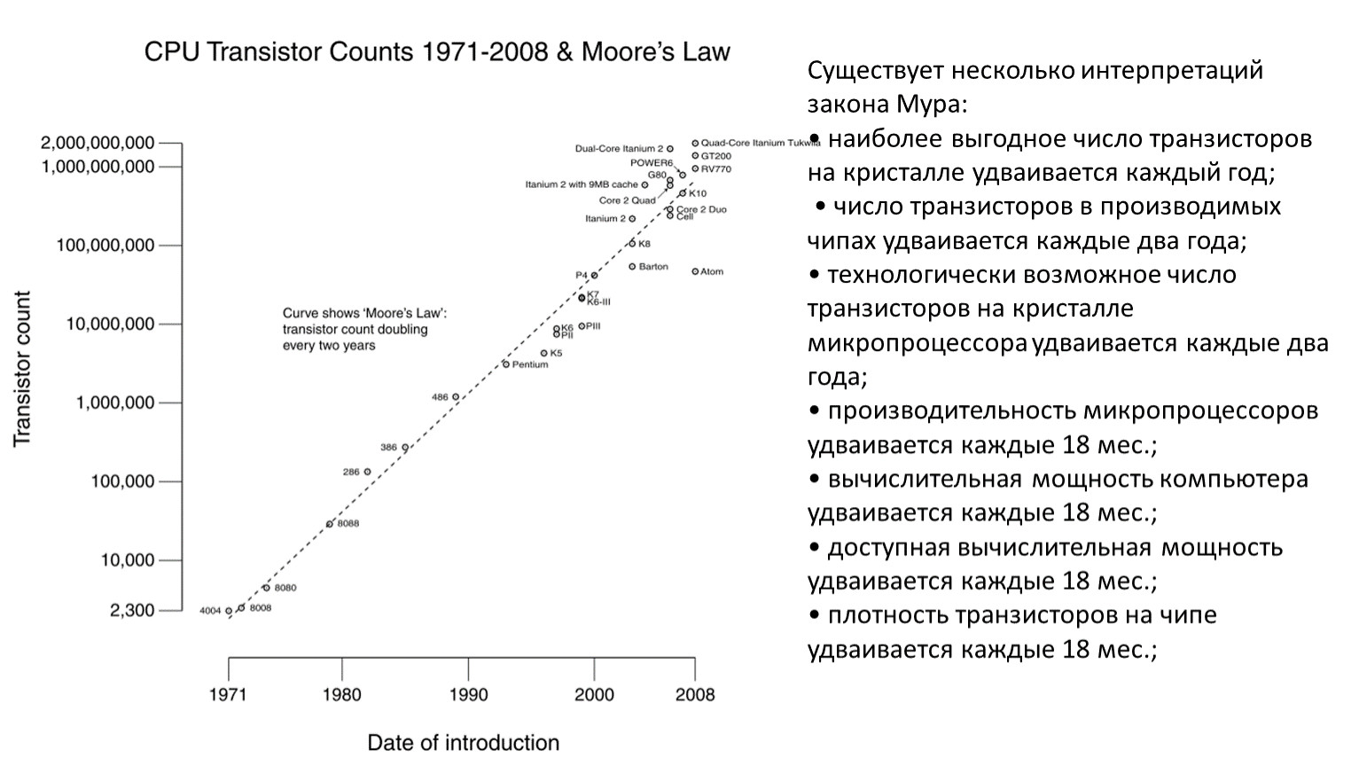 • технологически возможное число транзисторов на кристалле микропроцессора удваивается каждые два года;