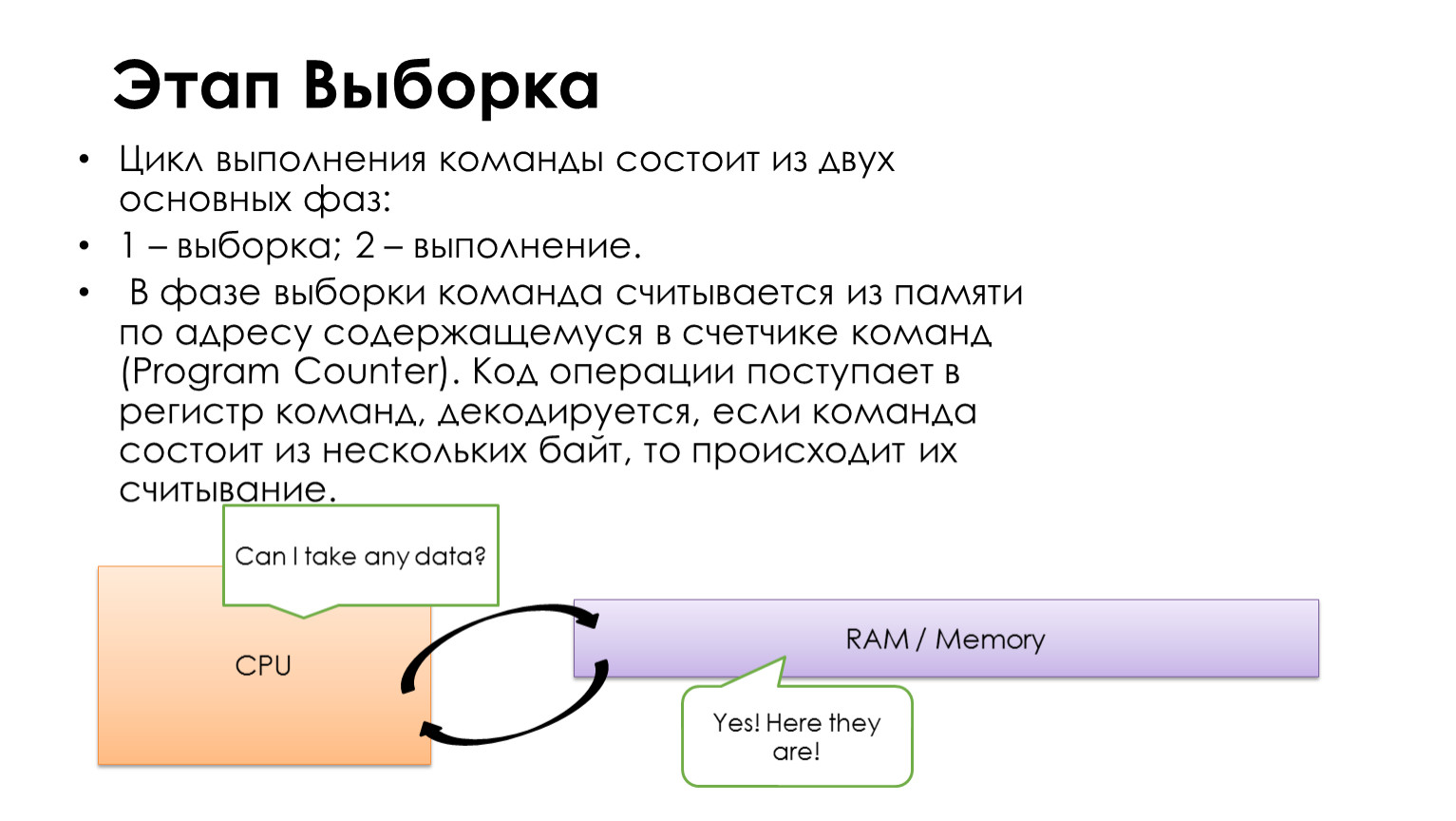 В фазе выборки команда считывается из памяти по адресу содержащемуся в счетчике команд (Program Counter). Код операции поступает в регистр команд, декодируется, если команда состоит из нескольких байт, то происходит их считывание.