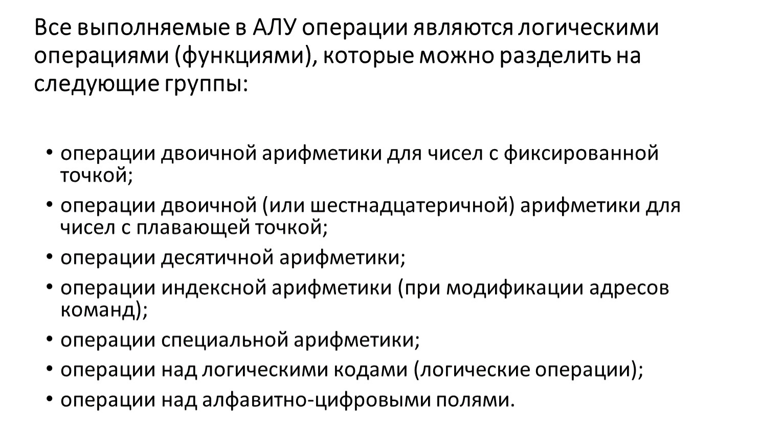 Все выполняемые в АЛУ операции являются логическими операциями (функциями), которые можно разделить на следующие группы: