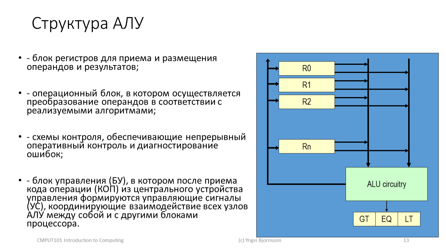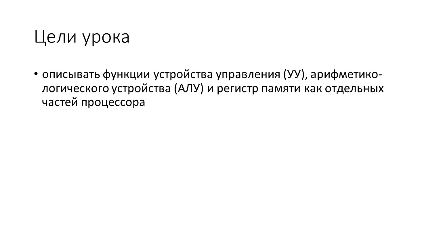 описывать функции устройства управления (УУ), арифметико- логического устройства (АЛУ) и регистр памяти как отдельных частей процессора