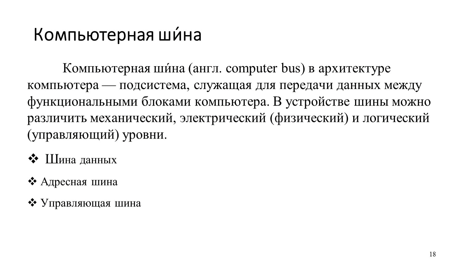Компьютерная ши́на (англ. computer bus) в архитектуре компьютера — подсистема, служащая для передачи данных между функциональными блоками компьютера. В устройстве шины можно различить механический, электрический (физический) и логический (управляющий) уровни.