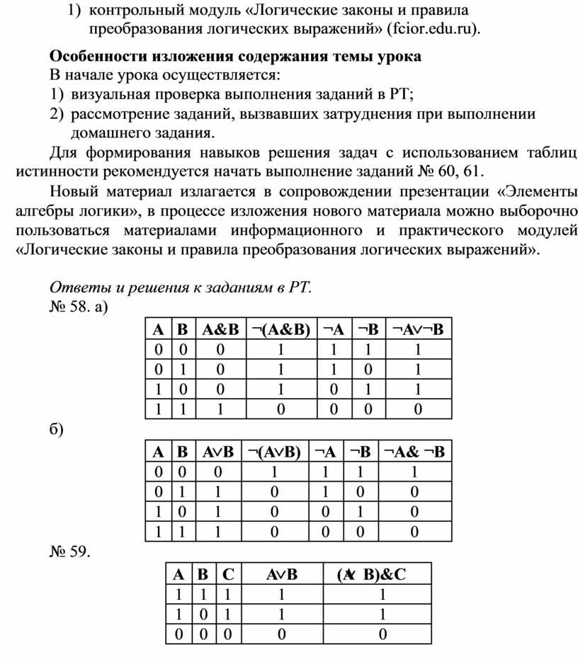 2) практический модуль «Логические законы и правила преобразования логических выражений» (fcior.edu.ru);