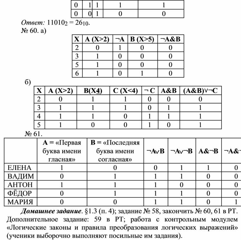 Для формирования навыков решения задач с использованием таблиц истинности рекомендуется начать выполнение заданий № 60, 61.