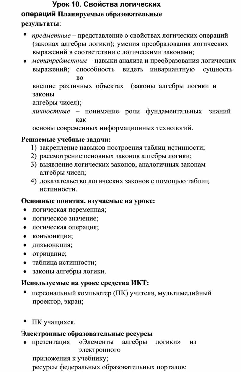 Урок 10. Свойства логических операций Планируемые образовательные результаты: