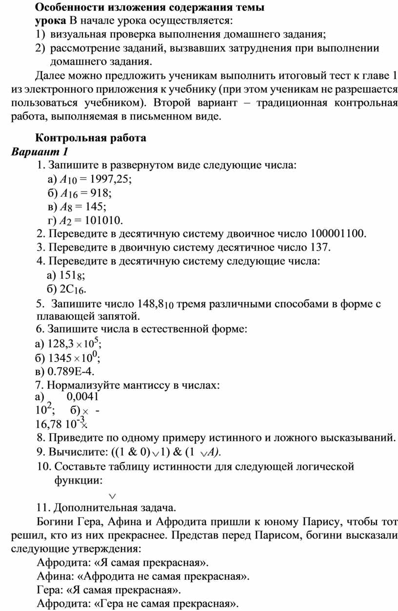тест «Математические основы информатики» из электронного приложения к учебнику.