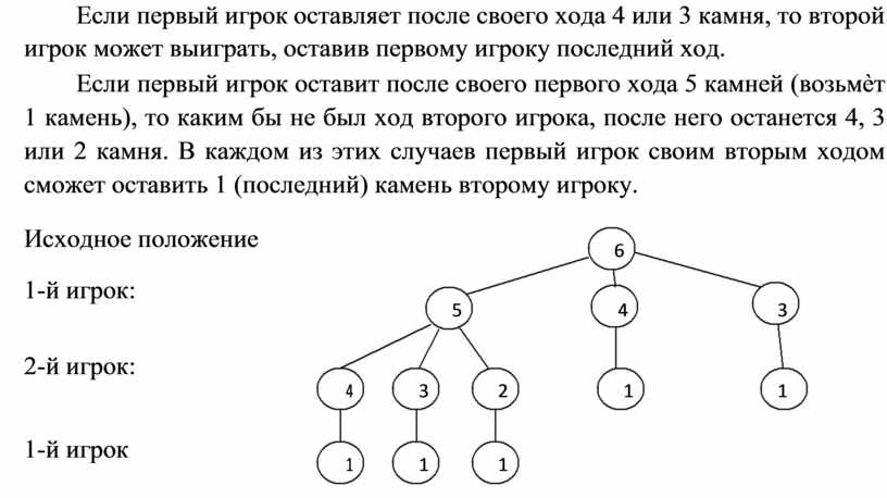 Если первый игрок оставит после своего первого хода 5 камней (возьмѐт 1 камень), то каким бы не был ход второго игрока, после него останется 4, 3 или 2 камня. В каждом из этих случаев первый игрок своим вторым ходом сможет оставить 1 (последний) камень второму игроку.