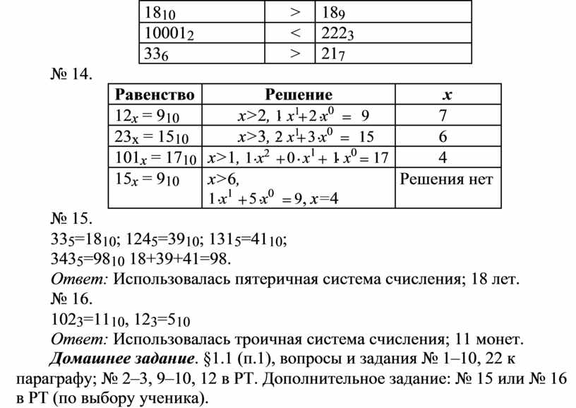 Ответ: Использовалась троичная система счисления; 11 монет. Домашнее задание. §1.1 (п.1), вопросы и задания № 1–10, 22 к