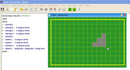 При наличии времени п. в) можно выполнить в среде КуМир. На рисунке (здесь и далее) положение Робота после исполнения алгоритма.