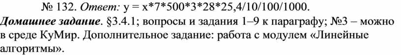 Домашнее задание. §3.4.1; вопросы и задания 1–9 к параграфу; №3 – можно в среде КуМир. Дополнительное задание: работа с модулем «Линейные алгоритмы».