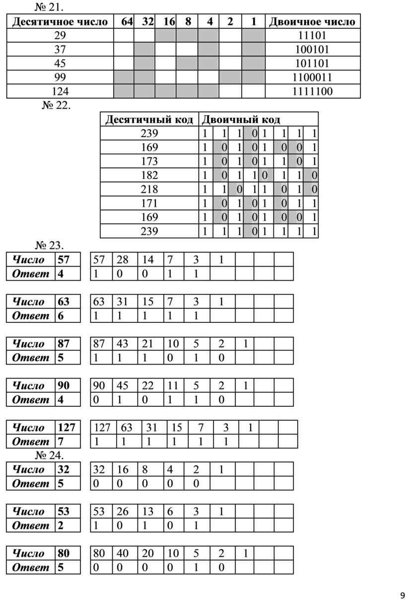 2) рассмотрение правила перевода двоичных чисел в десятичную систему счисления;