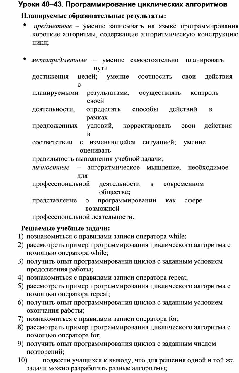предметные – умение записывать на языке программирования короткие алгоритмы, содержащие алгоритмическую конструкцию цикл;