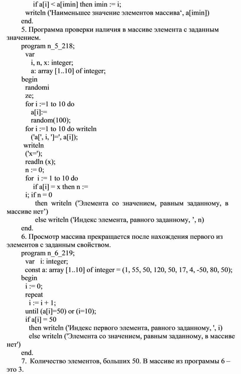 5) рассмотреть примеры и получить опыт решения типовых задач по обработке массивов (суммирование, поиск, наименьшего / наибольшего значения, подсчет количества элементов с некоторым свойством);