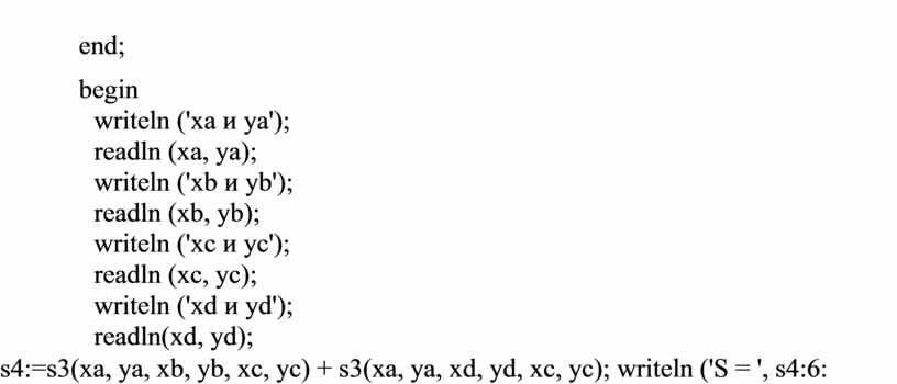 s4:=s3(xa, ya, xb, yb, xc, yc) + s3(xa, ya, xd, yd, xc, yc); writeln ('S = ', s4:6: