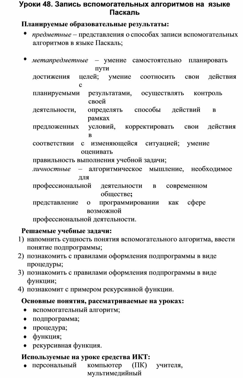 Уроки 48. Запись вспомогательных алгоритмов на языке Паскаль
