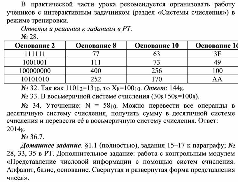 В практической части урока рекомендуется организовать работу учеников с интерактивным задачником (раздел «Системы счисления») в режиме тренировки.