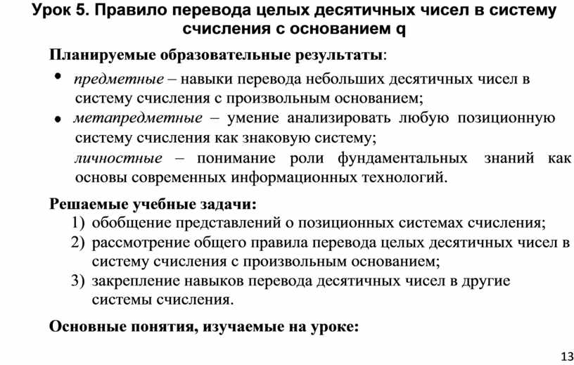 2) рассмотрение общего правила перевода целых десятичных чисел в систему счисления с произвольным основанием;