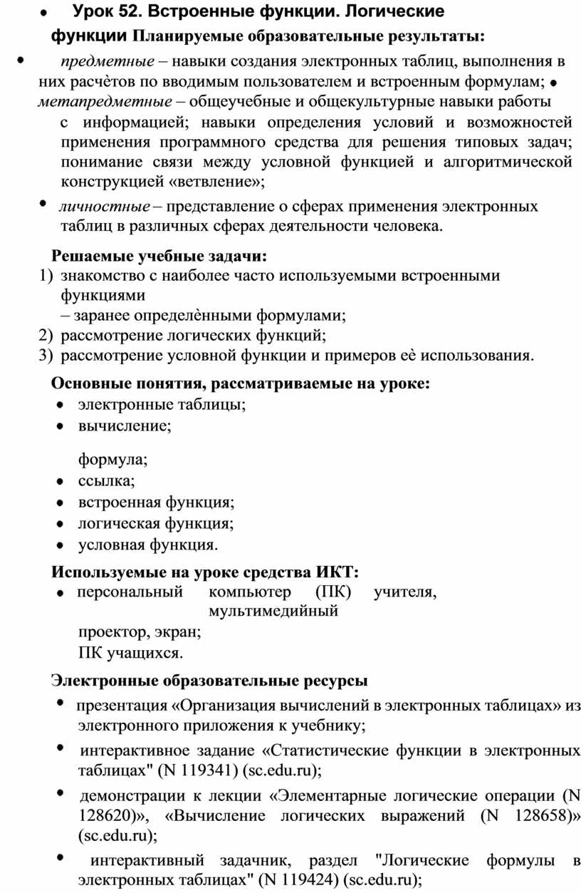 Урок 52. Встроенные функции. Логические функции Планируемые образовательные результаты: