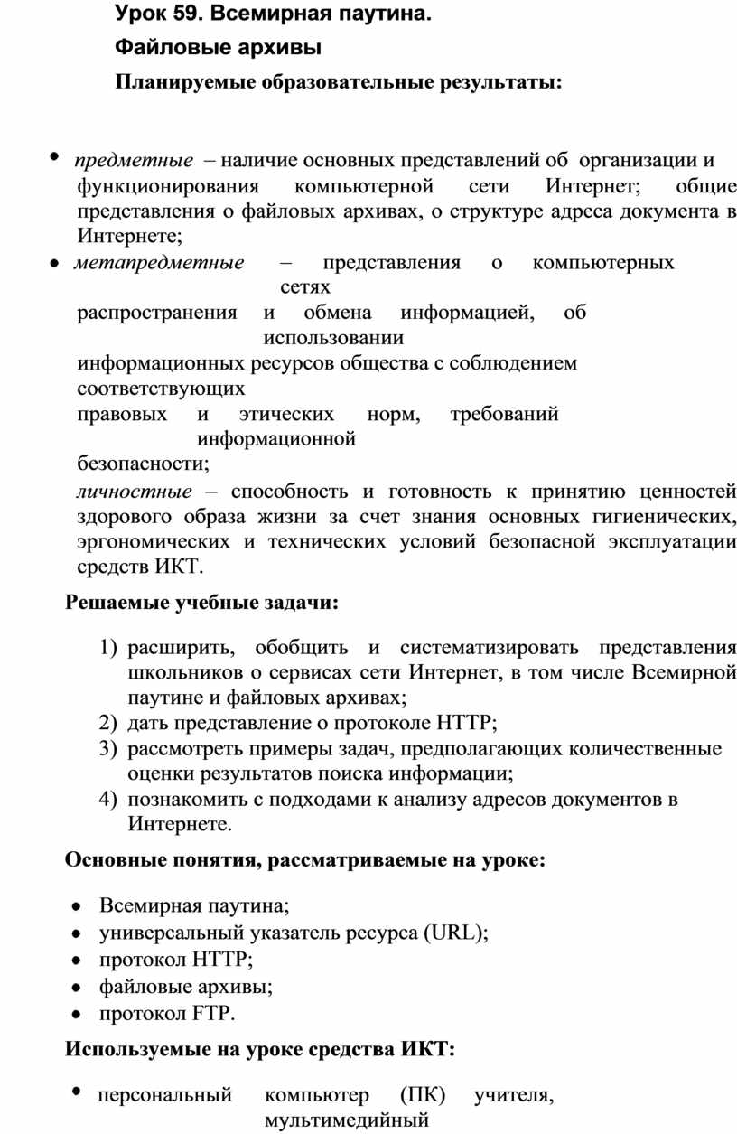1) расширить, обобщить и систематизировать представления школьников о сервисах сети Интернет, в том числе Всемирной паутине и файловых архивах;