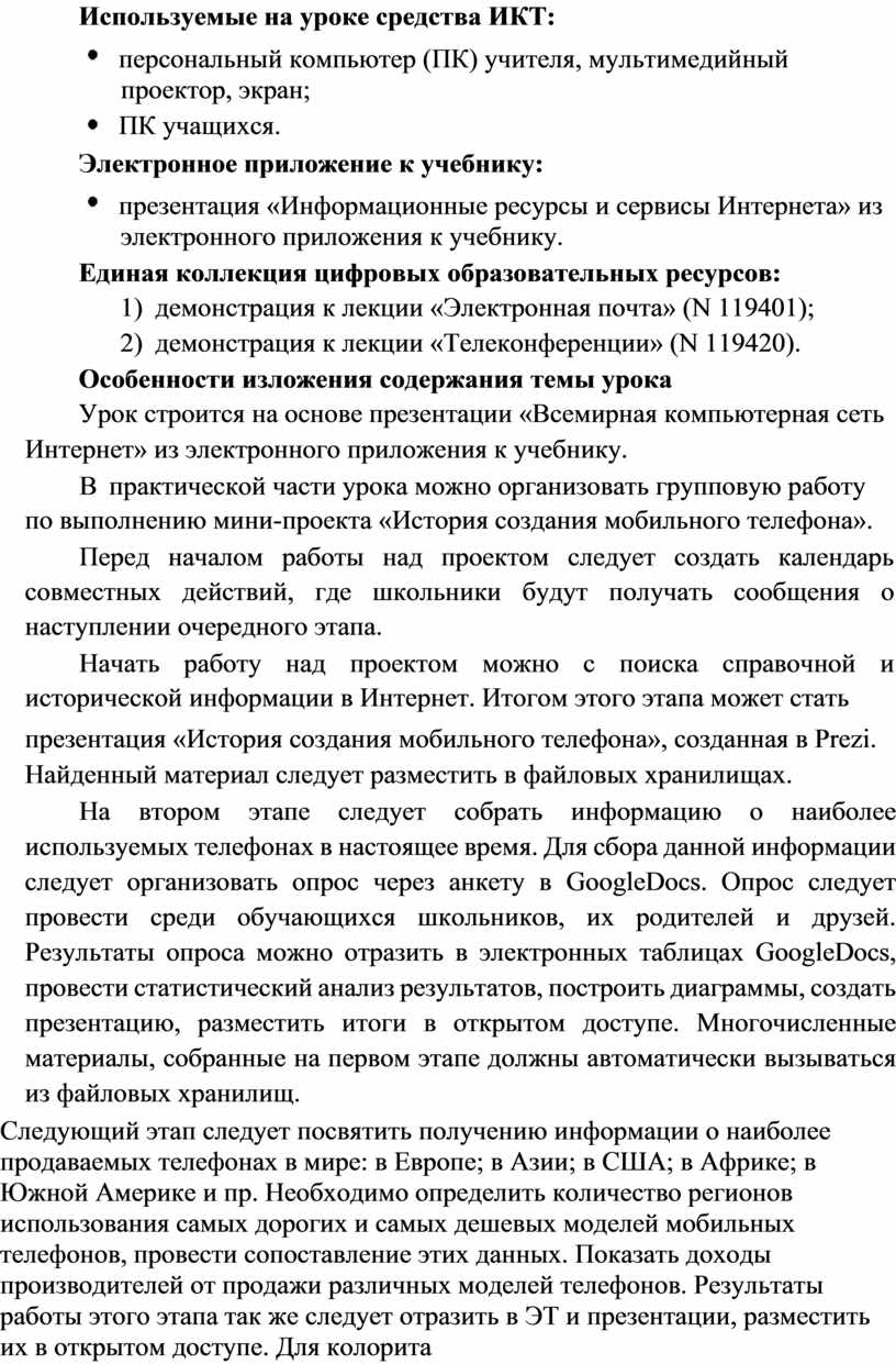 В практической части урока можно организовать групповую работу по выполнению мини-проекта «История создания мобильного телефона».