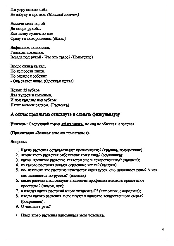 Учитель: Следующий город «Аптечка», но она не обычная, а зеленая