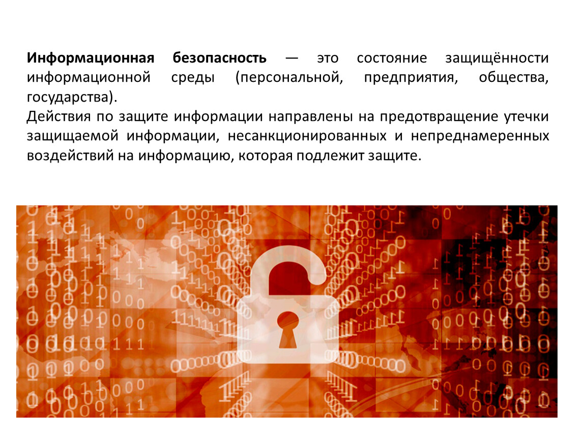 Информационная безопасность — это состояние защищённости информационной среды (персональной, предприятия, общества, государства).
