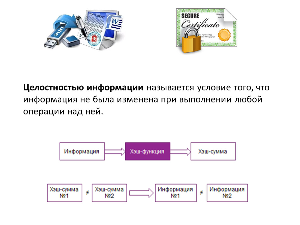 Целостностью информации называется условие того, что информация не была изменена при выполнении любой операции над ней.