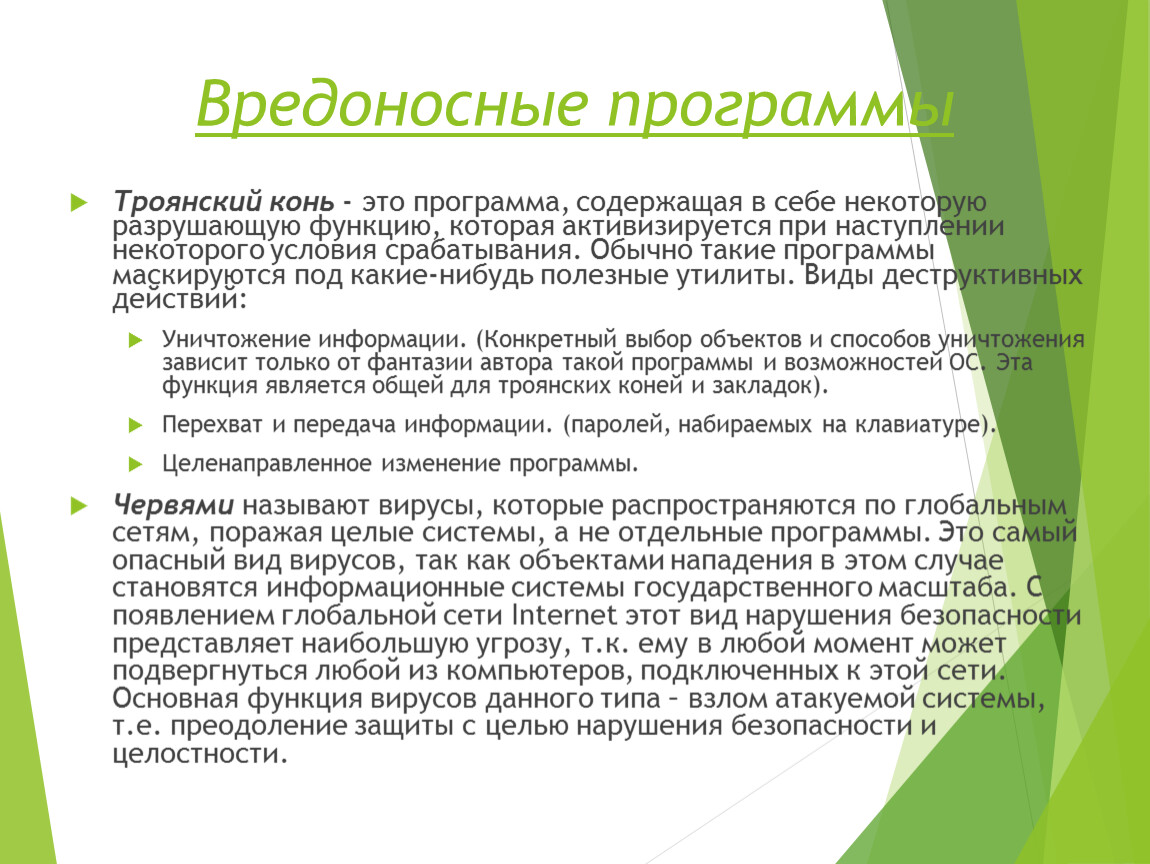 Троянский конь - это программа, содержащая в себе некоторую разрушающую функцию, которая активизируется при наступлении некоторого условия срабатывания. Обычно такие программы маскируются под какие-нибудь полезные утилиты. Виды деструктивных действий: