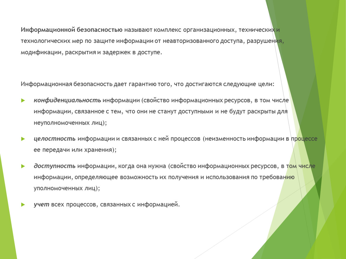 Информационной безопасностью называют комплекс организационных, технических и технологических мер по защите информации от неавторизованного доступа, разрушения, модификации, раскрытия и задержек в доступе.